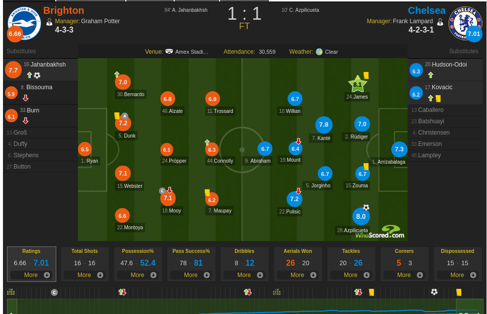 A spectacular overhead kick from Alireza Jahanbakhsh secured a 1-1 draw for Brighton & Hove Albion against Chelsea at Amex Stadium.