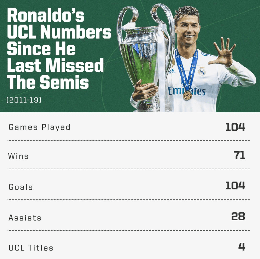 For the first time since 2015, Ronaldo will not win the Champions League and he also misses out on the semi-finals for the first time since 2009/2010 season.