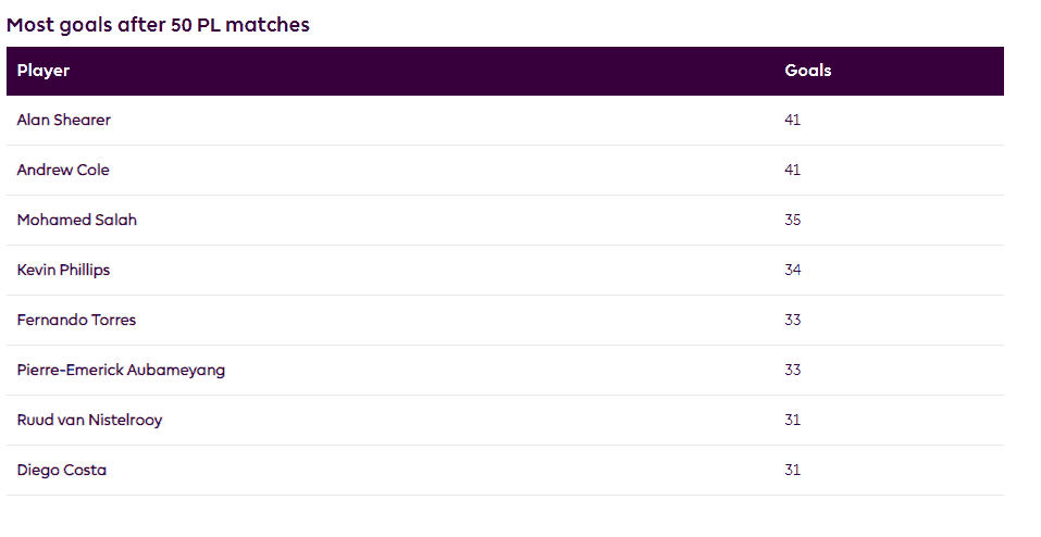Alam Shearer and Andrew Cole, who have scored 41 goals in 50 games.