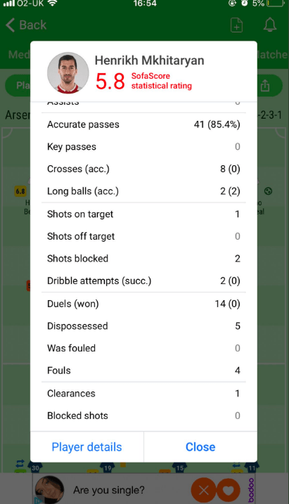 SofaScore представляет статистику полузащитника «Арсенала» Генриха Мхитарян против «Вест Хэм».