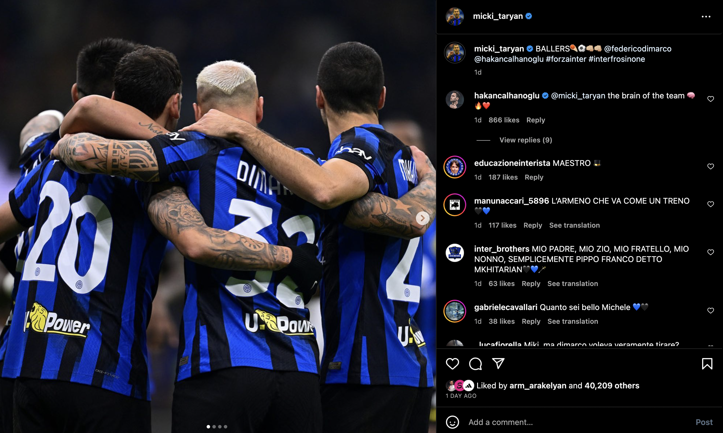 Полузащитник «Интера» Генрих Мхитарян, после победы над «Фрозиноне» (2:0) в матче 12 тура Серии А, выложил фото в Instragram с защитником Федерико Димарко и Хаканом Чалханоглу, оставив коммент: «Ballers». Об игрока оформили по голу в этот день.