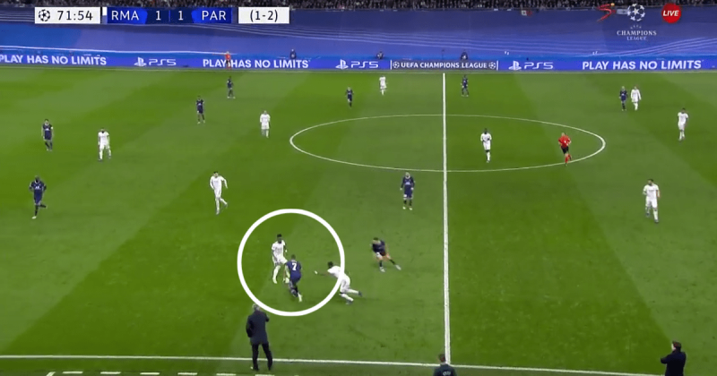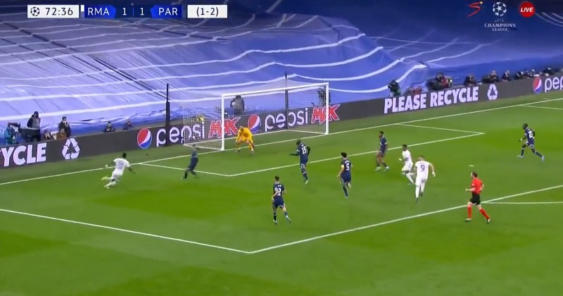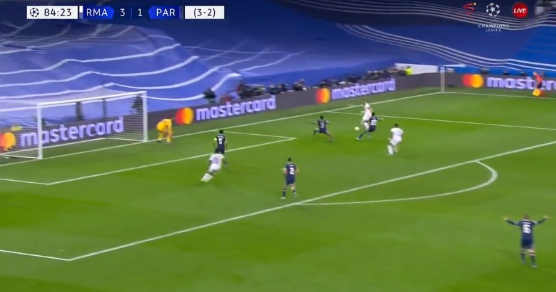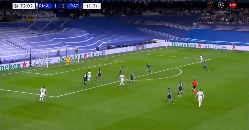 После второго пропущенного гола футболисты «ПСЖ» разыграли мяч с центра поля, и Марко Верратти отдал пас на Идрисса Гуйе, не заметив, что Родриго прочитал его и начал прессинг. Бразилец совершил отбор, Модрич начал контратаку, в ходе которой Маркиньос неудачно выбил мяч (или отдал непонятный пас на партнера), после которого Бензема забил третий мяч.donnarumma 😹pic.twitter.com/WQqqJosCri