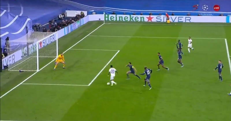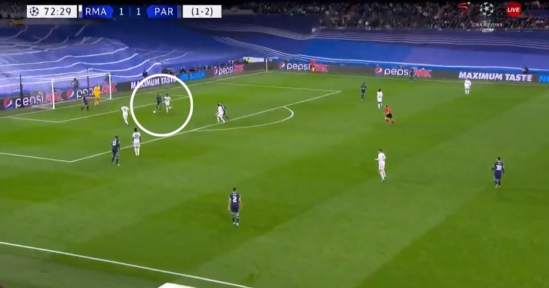 Но в отрезок, когда «Реал» забил свои голы, «Париж» мог бы пропустить больше. Эпизод 1: Мбаппе теряет мяч в центре поля, после чего «Сливочные» проводят быструю атаку. Бензема отдает неудачный пас на Родриго, но мяч попадает в ногу Мендеша и доходит до Винисиуса, который уже не принимал активное участие в атаке. Бразилец промахивается с хорошей позиции. эHere's Benzema's goal for his hat-trick. Real Madrid now lead on aggregate 3-2. #UCL (via @CBSSportsGolazo) pic.twitter.com/9K7nRUUNzv