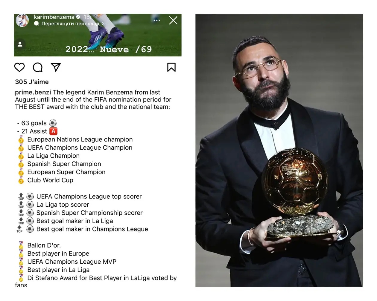 После церемонии обладатель «Золотого мяча» 2022 года, форвард мадридского «Реала» Карим Бензема выложил в сторис Instagram список своих достижений за 2022-й год с подписью: «Выглядит впечатляюще, не так ли?». Многие фанаты восприняли это как обиду на то, что француз не выиграл награду The Best от FIFA.