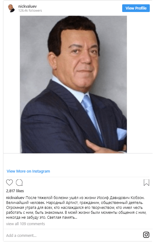 - После тяжелой болезни уше из жизни Иосиф Давидович Кобзон. Величайший человек, - написал в Инстаграме Валуев. - Народный Артист, гражданин, общественный деятель. Огромная утрата для всех, кто наслаждался его творчеством, кто имел честь работать с ним, быть знакомым. В моей жизни были моменты общения с ним, никогда не забуду это. Светлая память...