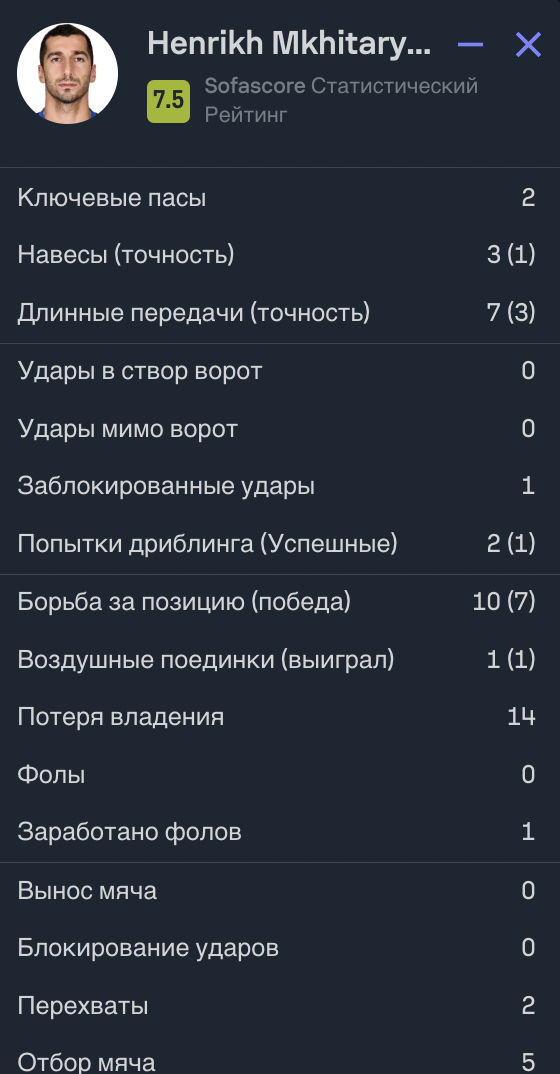 Хавбек «нерадзурри» Генрих Мхитарян отыграл весь матч. Портал SofaScore представляет статистику армянского игрока.